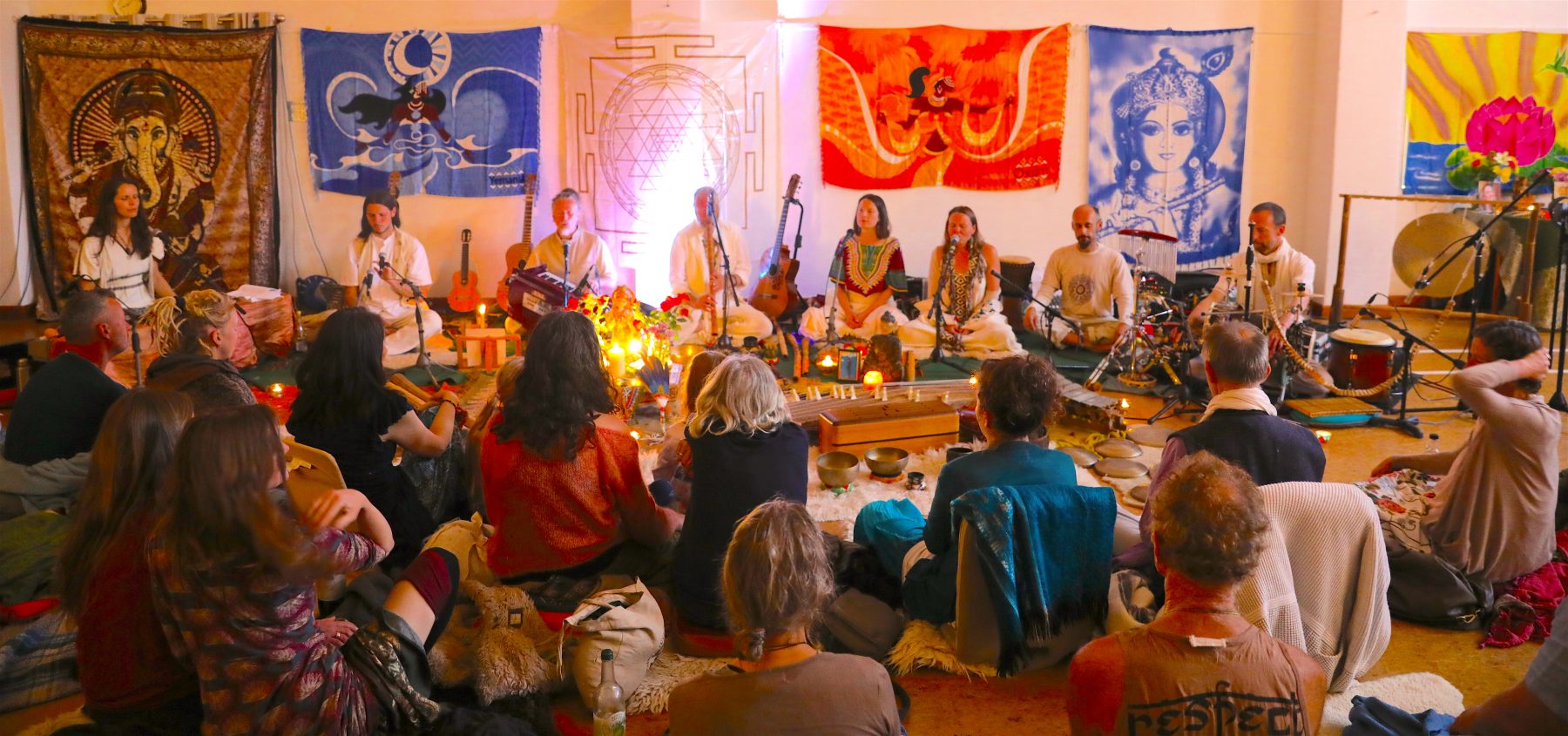 There will be a focused mood, with relaxed access to come and go from the chai cafe, to dance or move at the back, sit and sing at the front, or lie down on a sheepskin ….